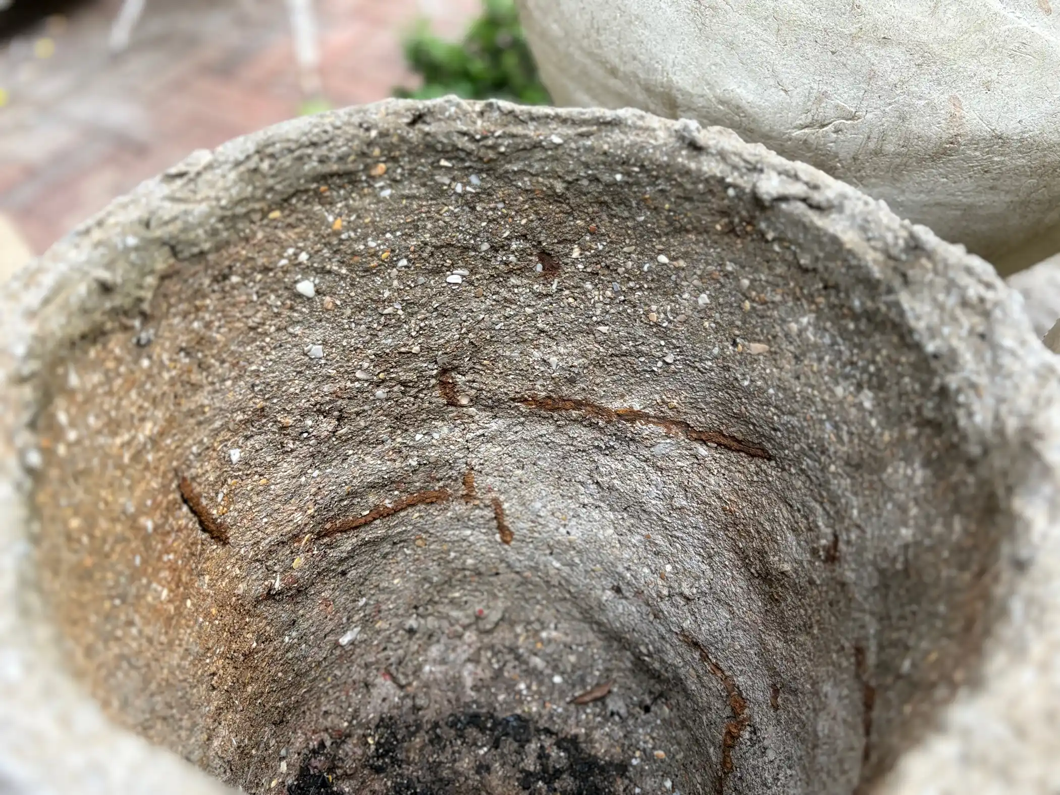 We can clearly date the pair because it is concrete poured over an iron skeleton (so post-Monsieur Monier’s 1867 patent), the exposed skeleton shows signs of advanced rust, and the cement consists of a primitive shale that was common at the end of the century — a true piece of faux bois history.