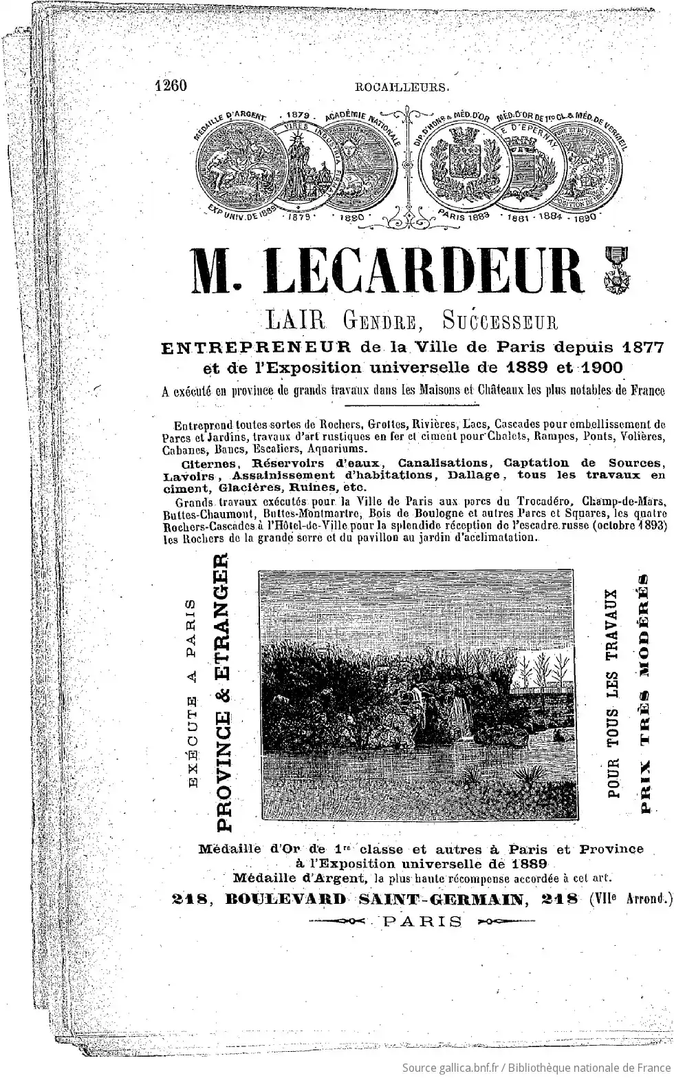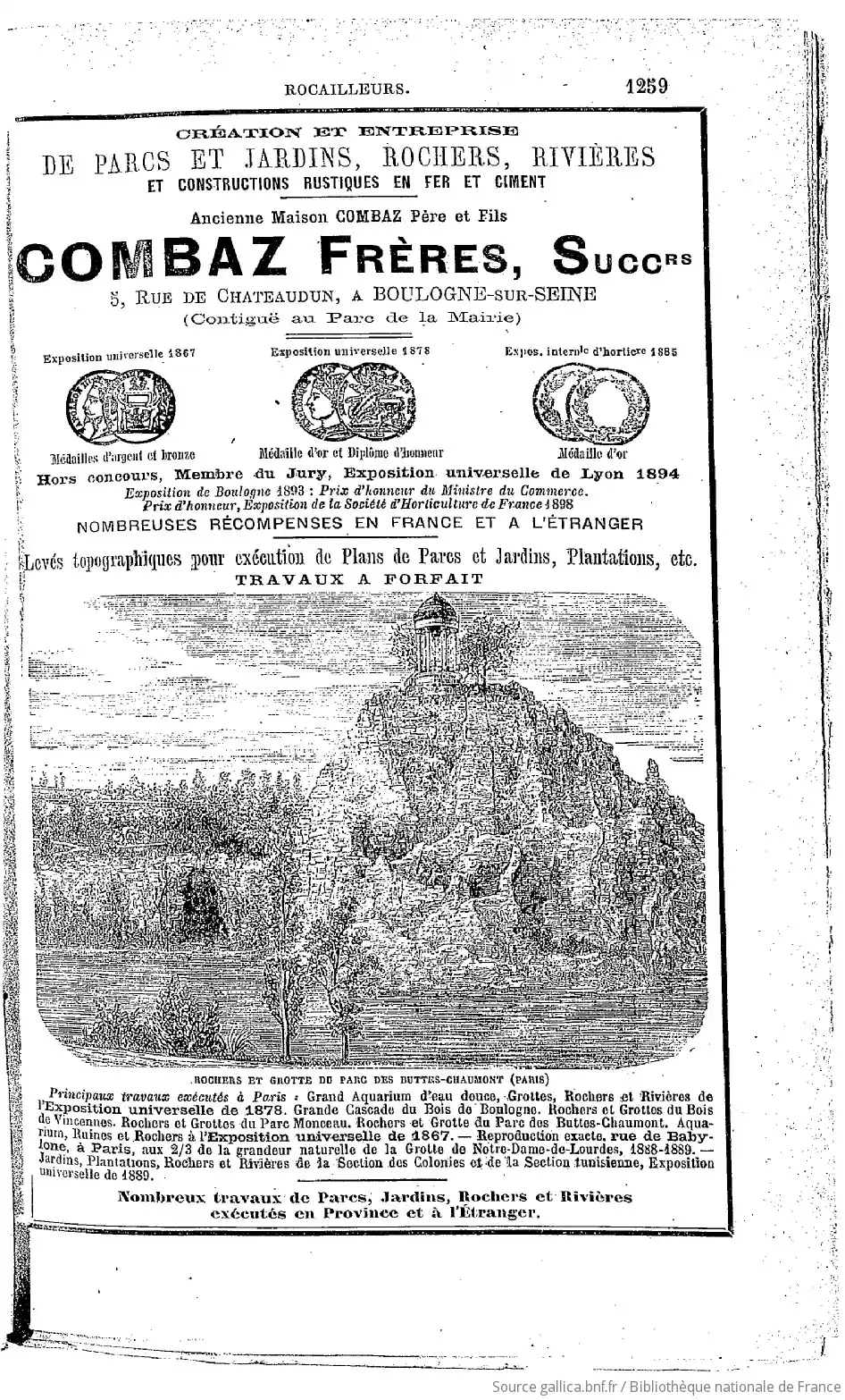 Notice in the third advertisement for Combaz Frères the cliffs of Parc des Buttes-Chaumont — they were the firm that was hired to create the rocaillage of many of Napeolon III’s new parks.