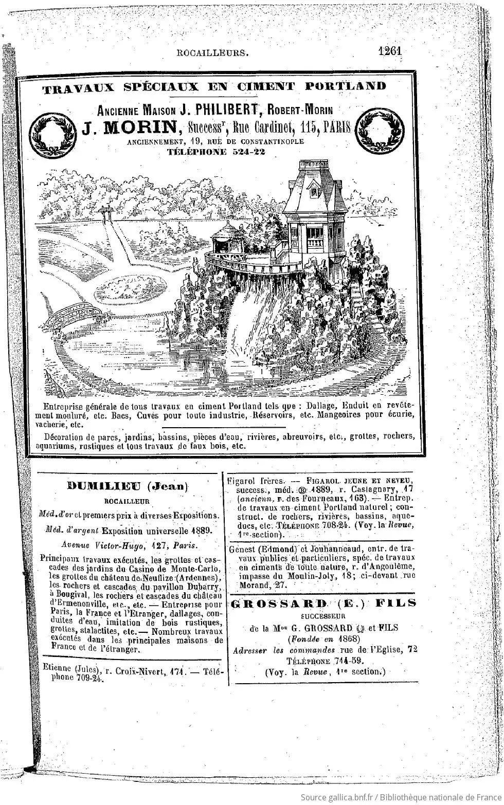 Here are 3 separate advertisements for prominent rocaillage firms, all taken from a 1901 Parisian classified ads journal. (Image Credit: Bibliothèque Nationale de France Digital Archives)