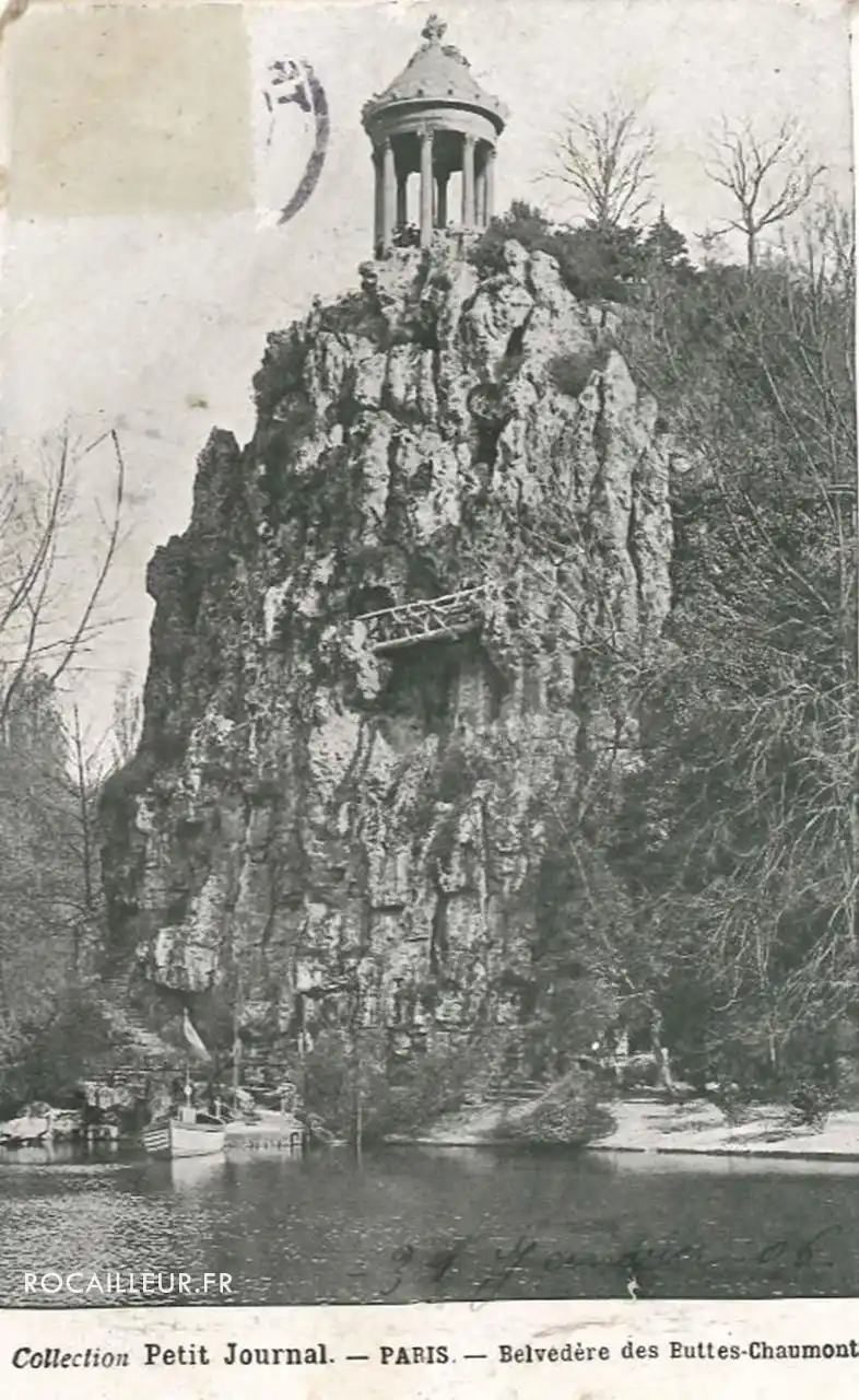 The defining feature of the park is the small island protruding from the center of a man-made lake (waterscaping was also a new technology of the time). The entire cliffside of the island was artificially shaped by rocailleurs with concrete, and then covered with tonnes of dirt to allow vegetation to begin growing again in the new park.