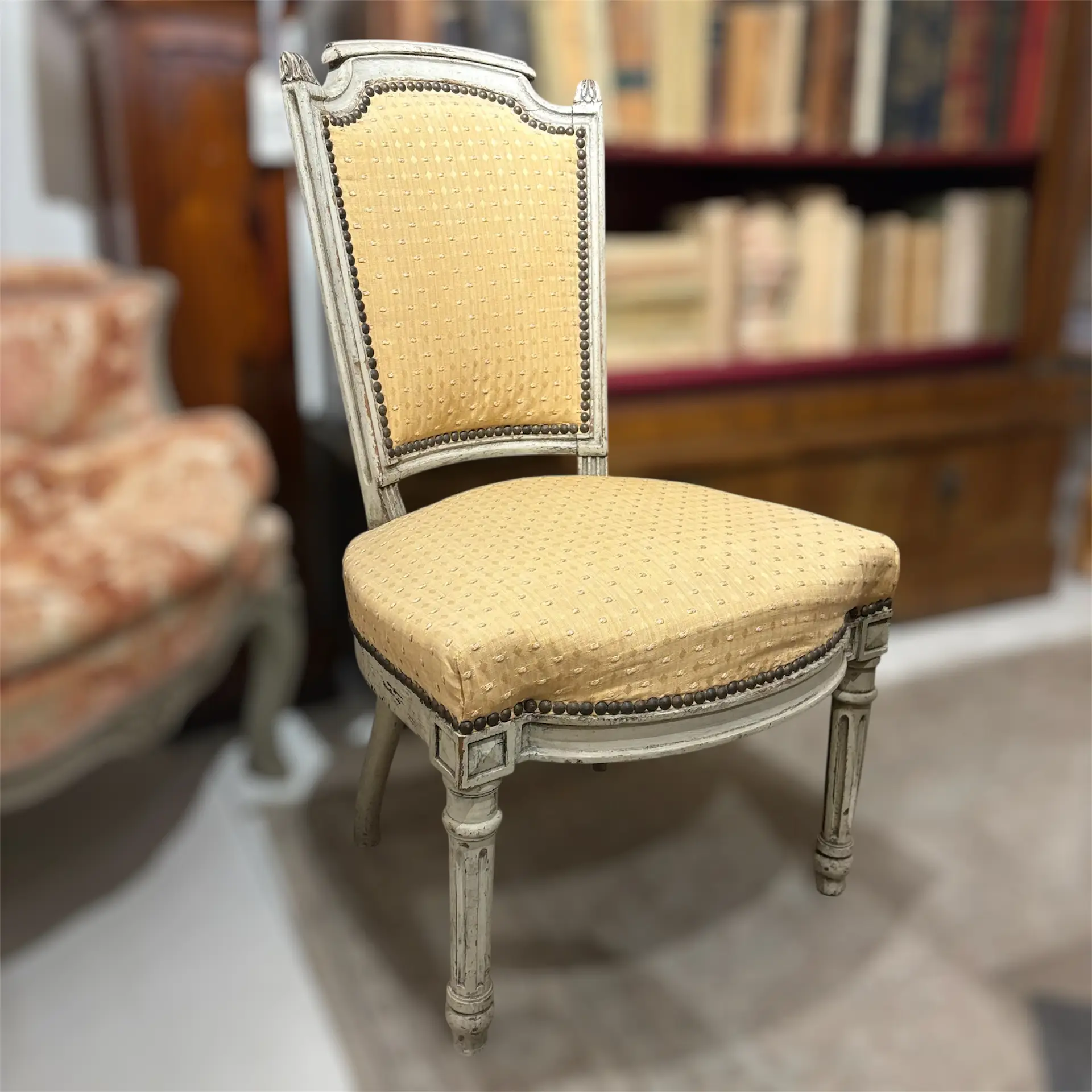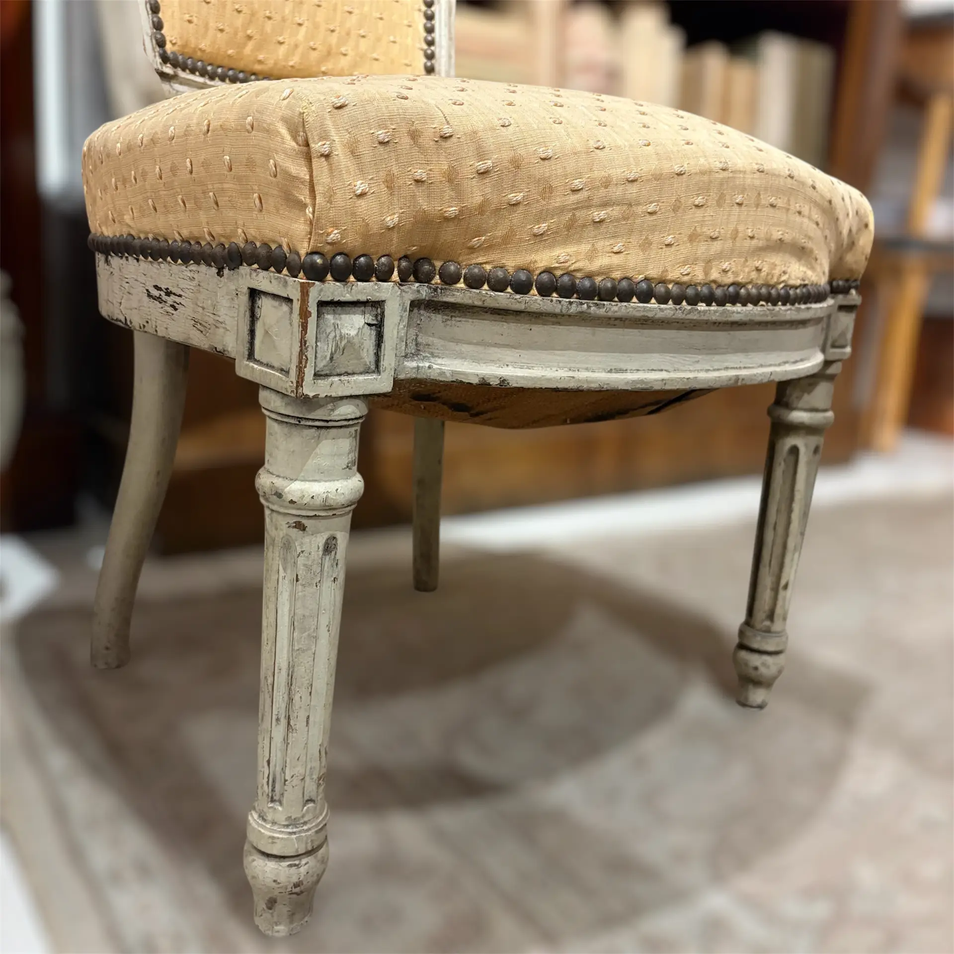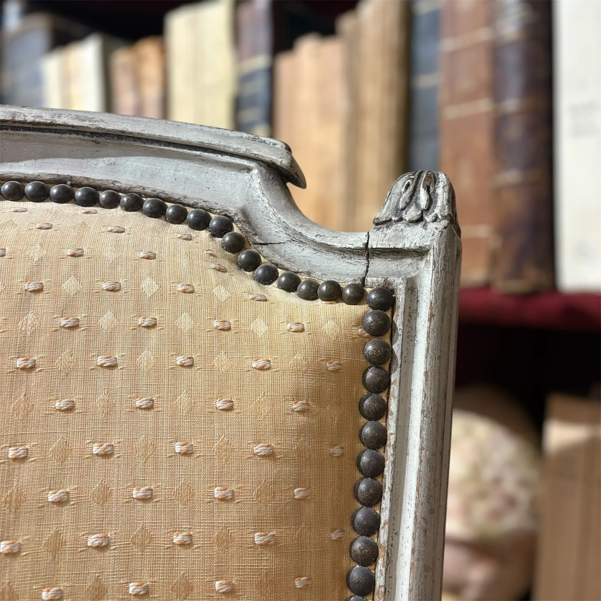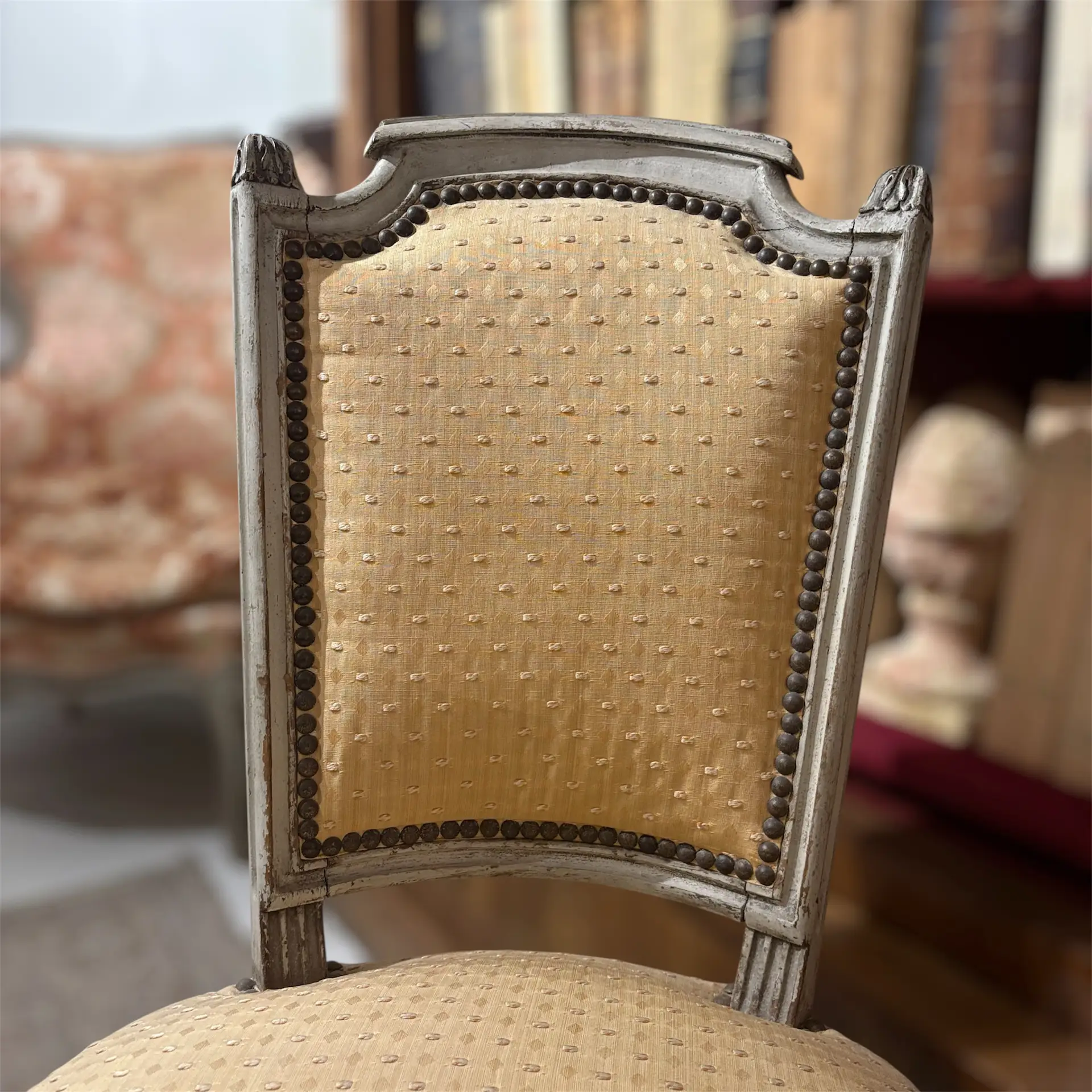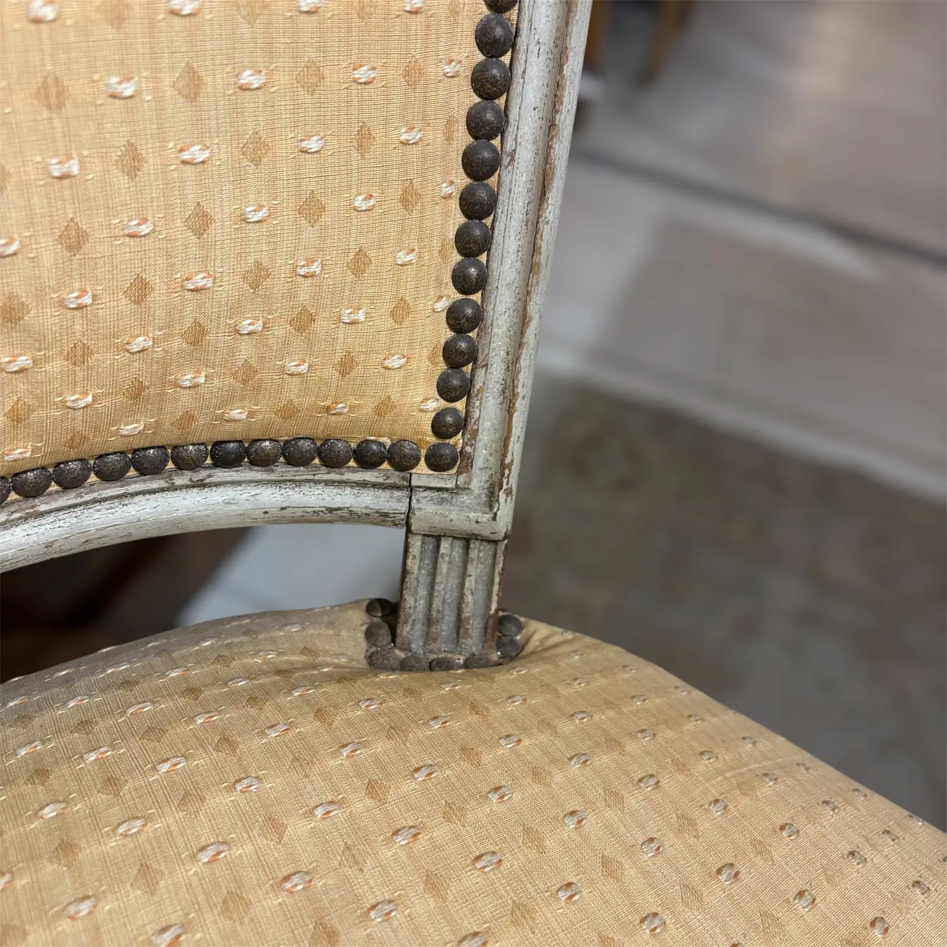 The golden textured upholstery, accented with brass nailhead trim, brings a gentle warmth to the cool tones of the painted wood. Though the fabric was replaced in the mid-20th century, the frames retain their original patina — softly worn by time, revealing hints of the artisan’s brush beneath.