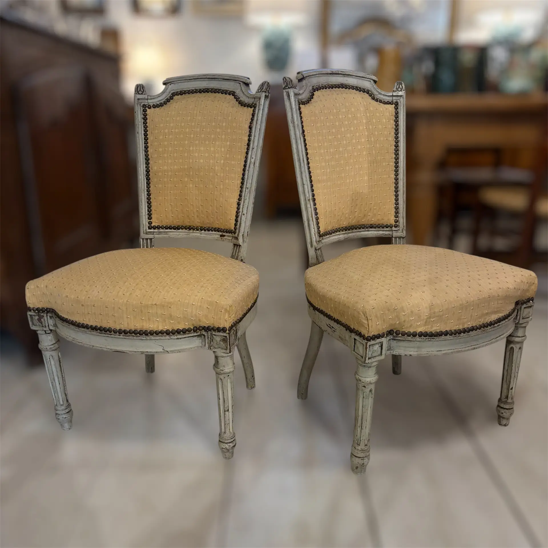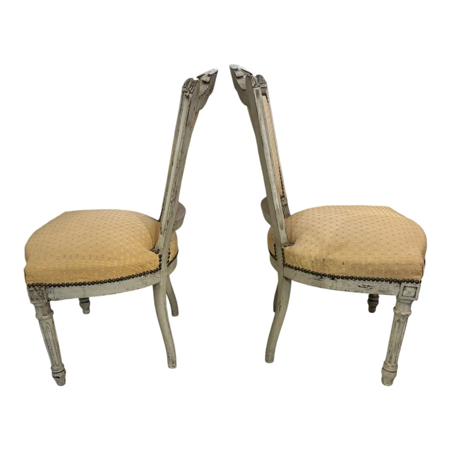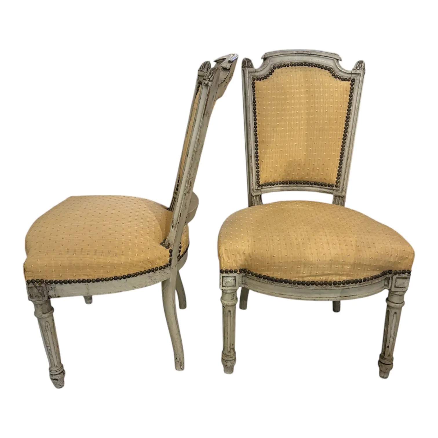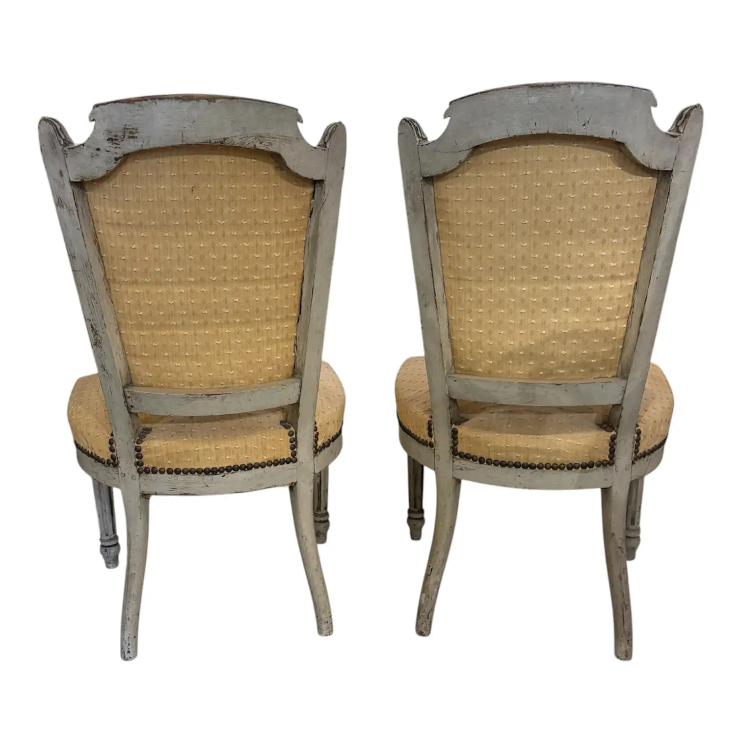A refined pair of French side chairs capturing the timeless grace of the Louis XVI revival. Hand-carved in beechwood and finished in a delicately aged celadon-grey, their sculpted backs and fluted legs evoke the quiet elegance of a 19th-century Parisian salon.