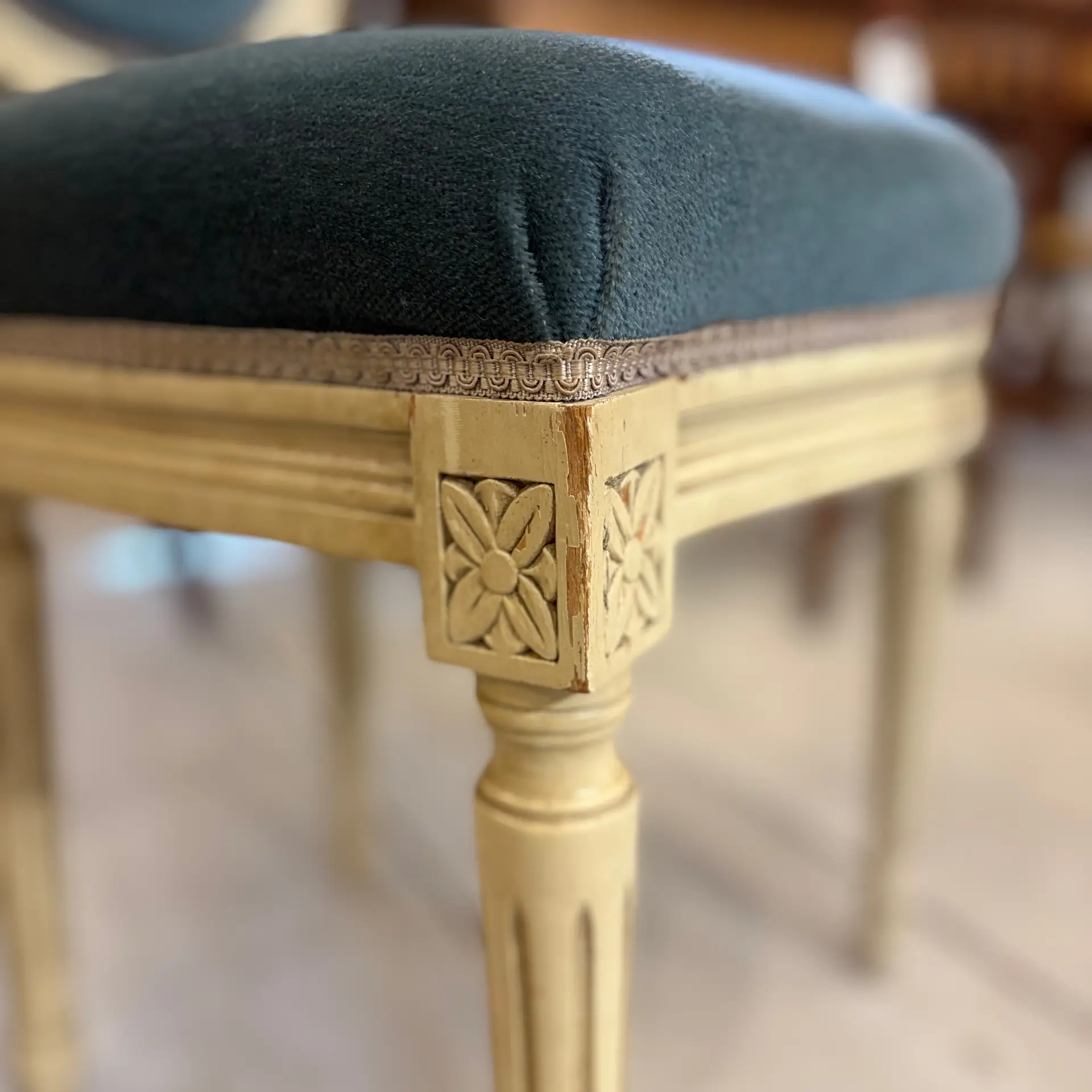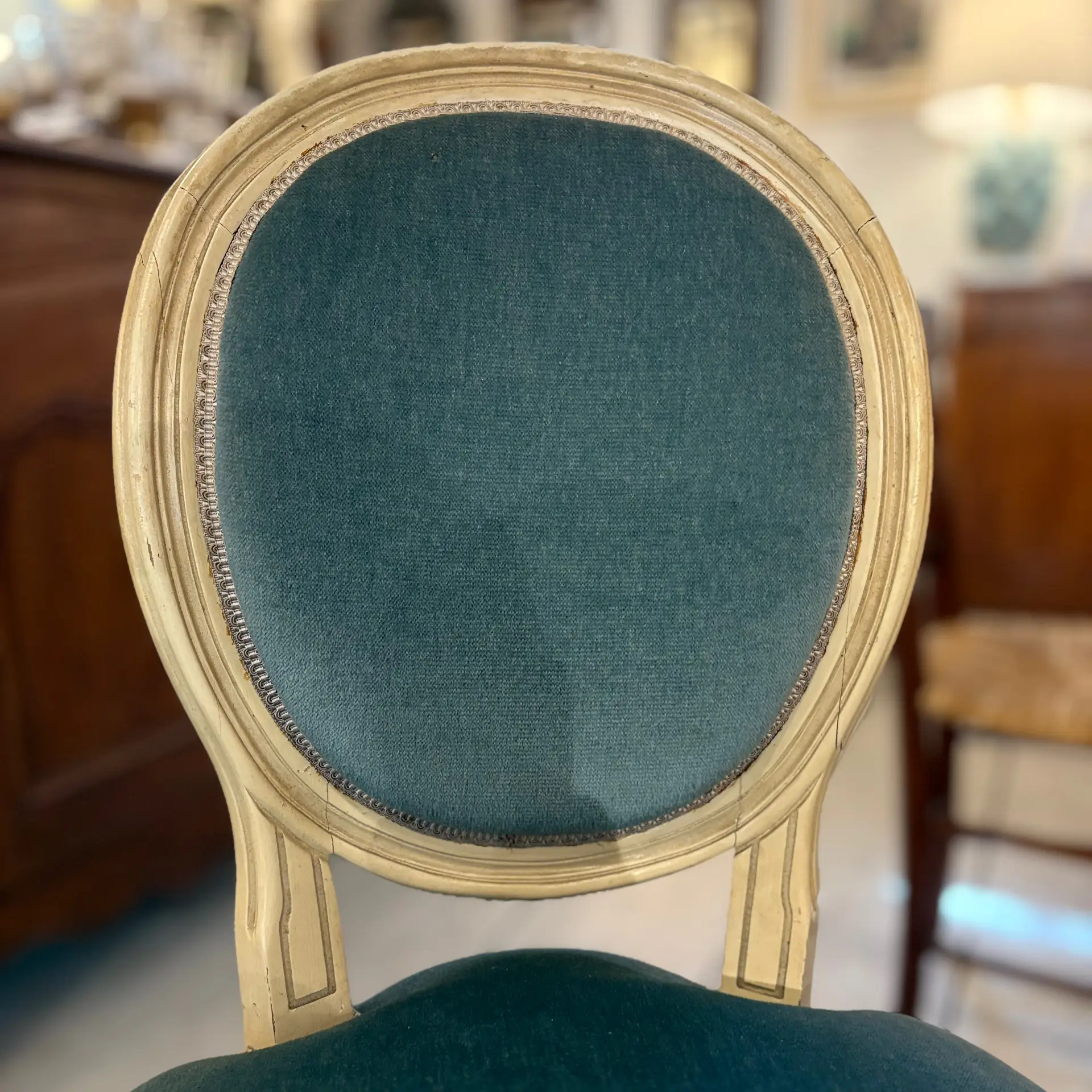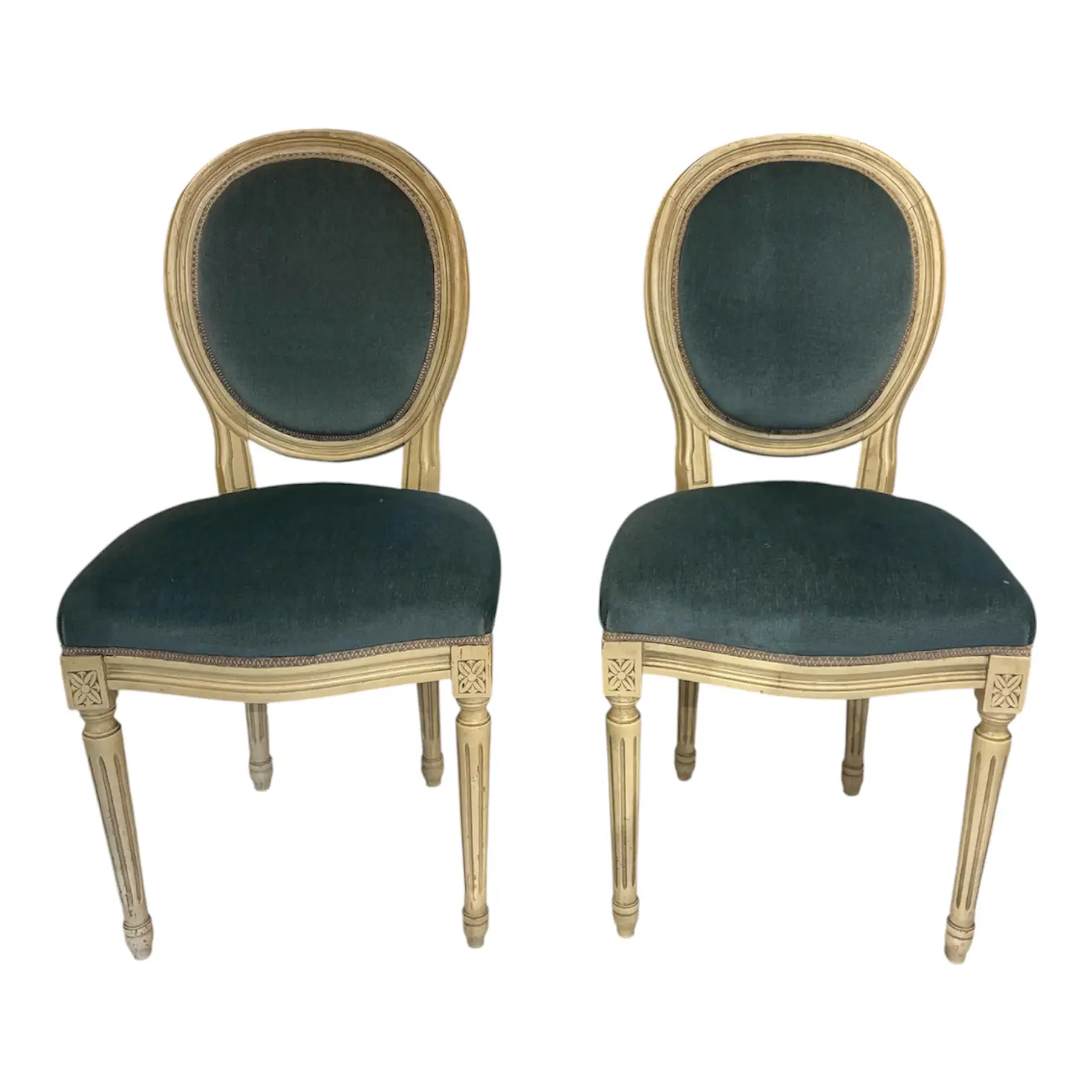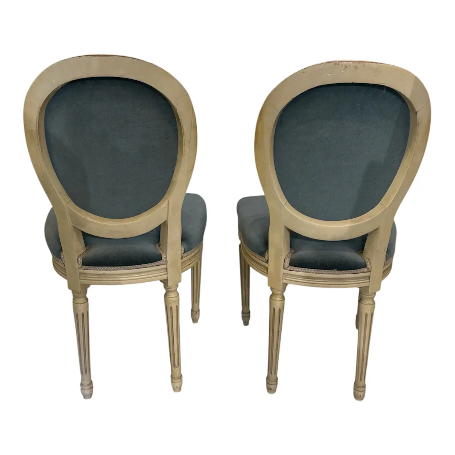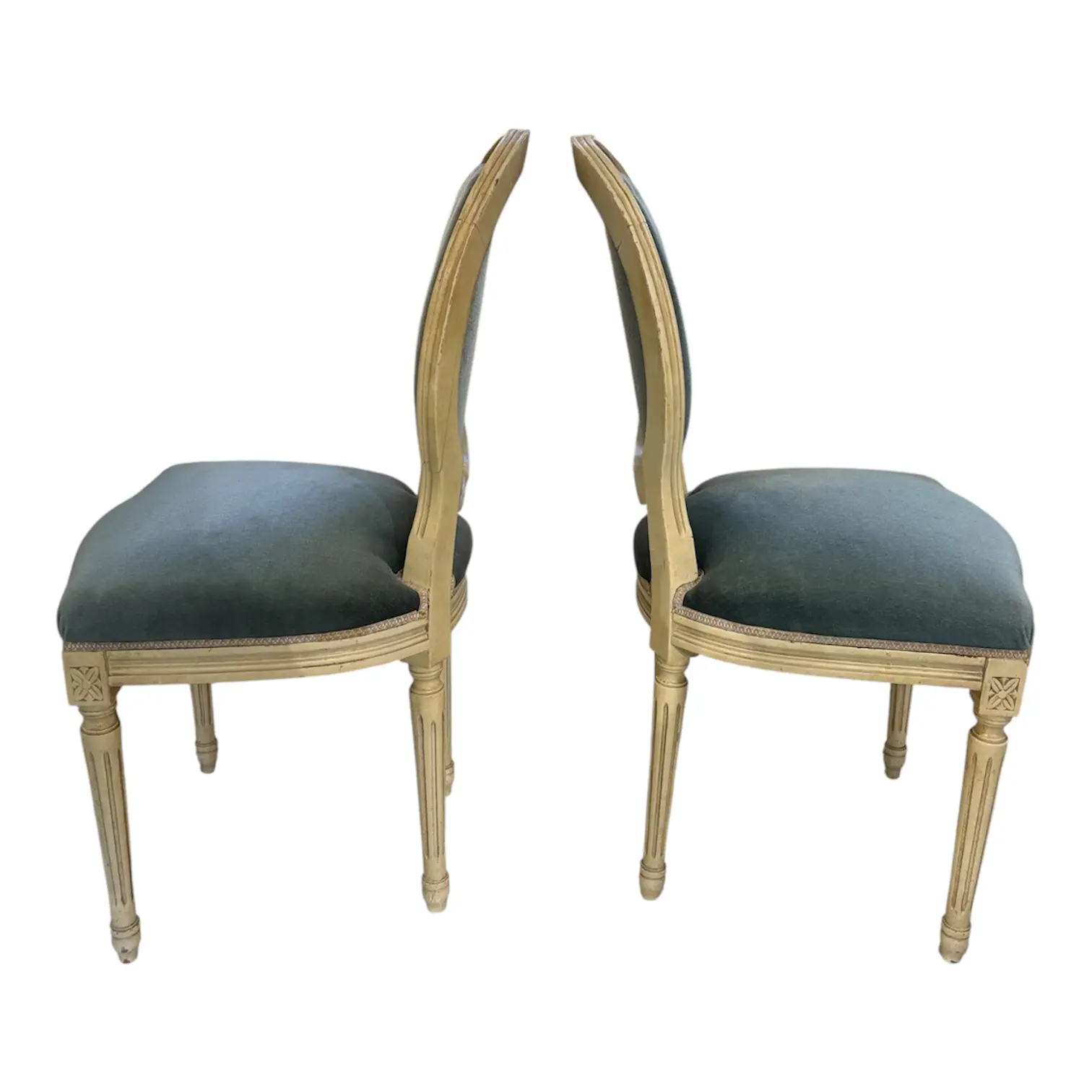 A refined pair of Louis XVI-style side chairs, each featuring an oval upholstered back and generous seat in deep teal velvet. The carved beechwood frames retain their original painted finish with delicate fluting along the legs and rosette motifs at the corners. Their timeless silhouette, with elegant tapering legs and neoclassical proportions, embodies the grace and symmetry of late 18th-century French design.