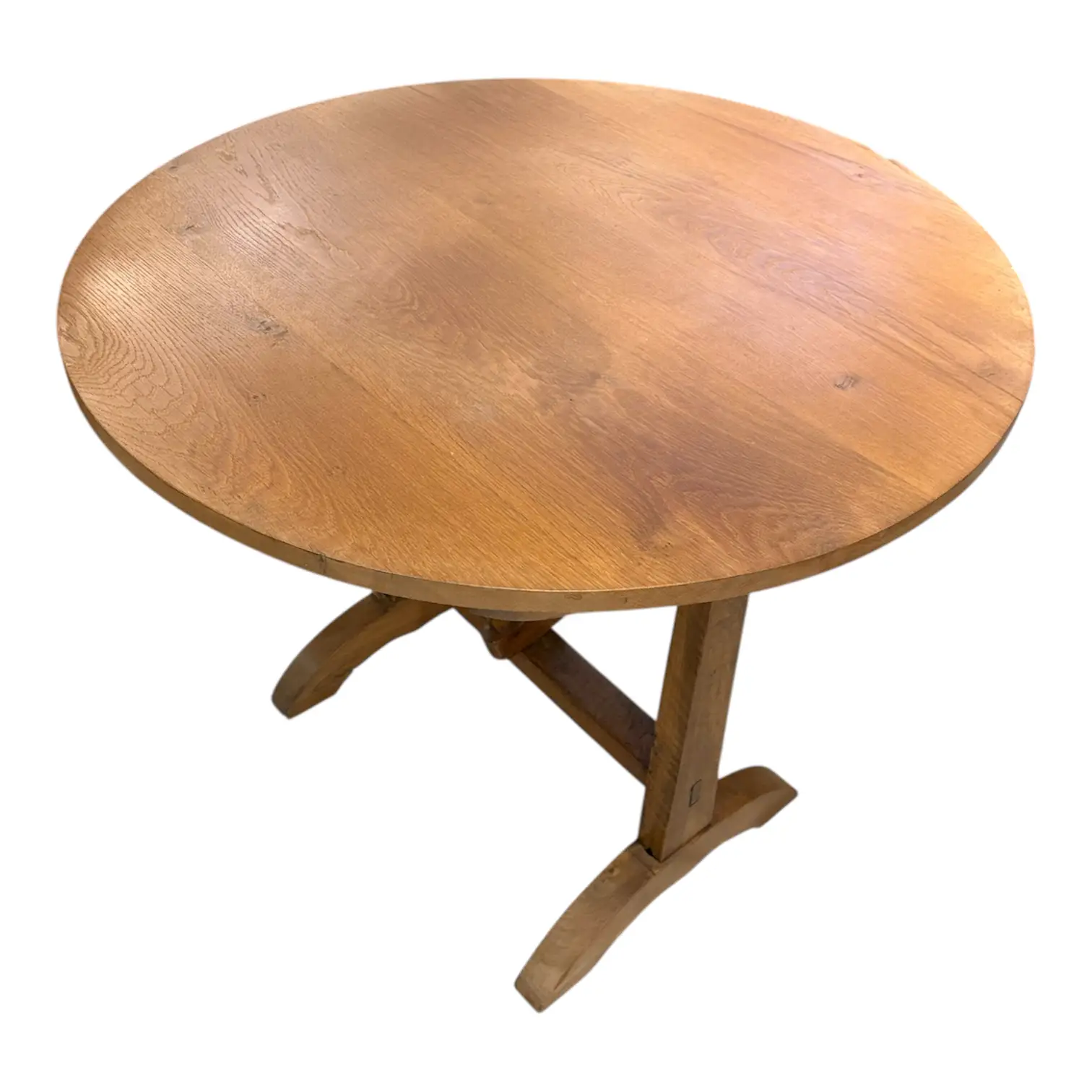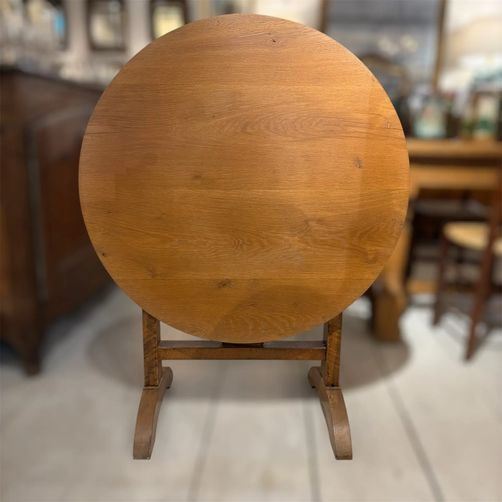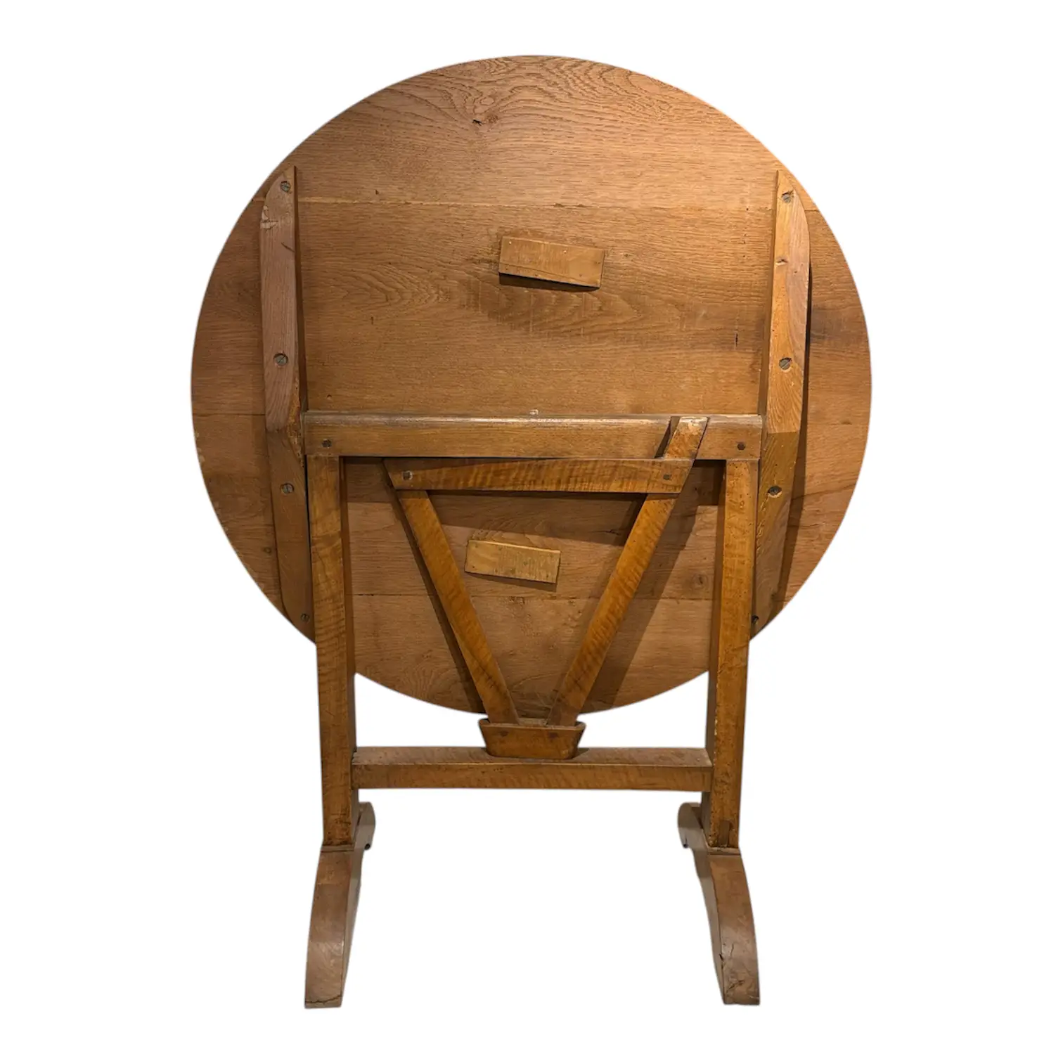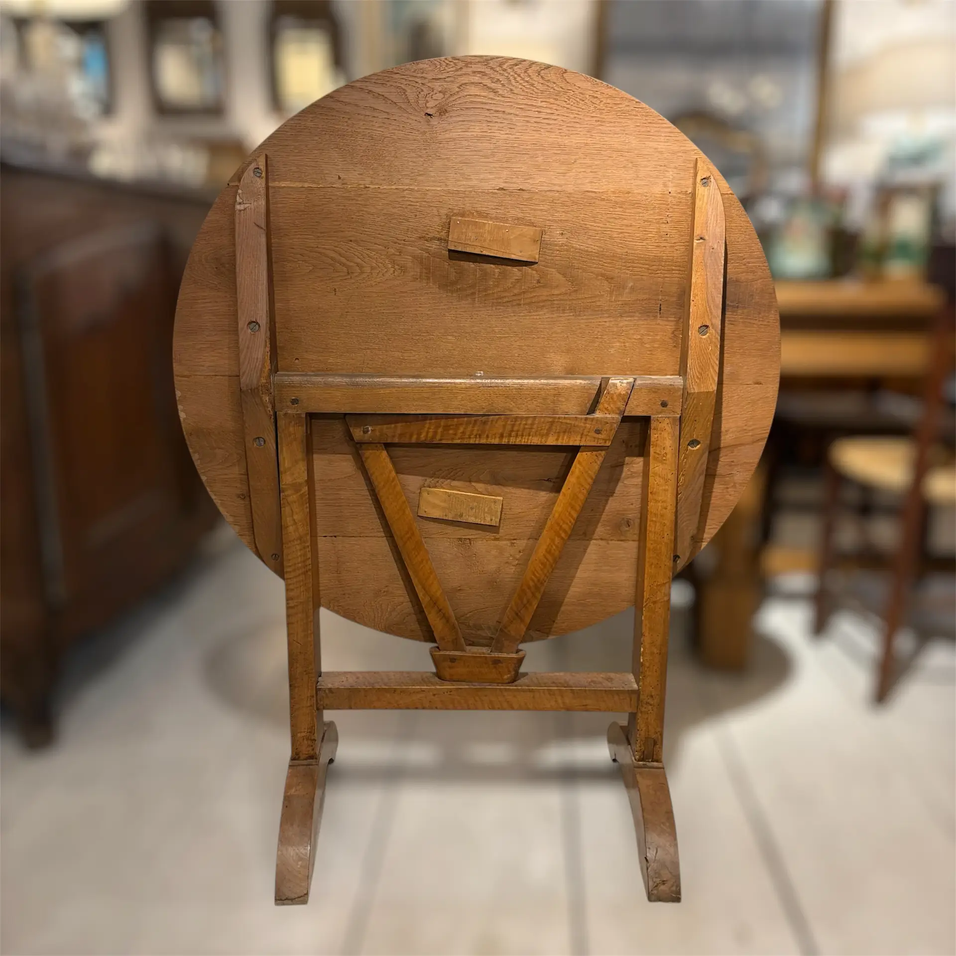 A charming 19th-century French tilt-top wine tasting table, hand-crafted in solid oak with a beautifully grained circular top and pegged joinery. The round top lifts and locks into an upright position for easy storage—a design once used in vineyard cellars and tasting rooms throughout rural France.