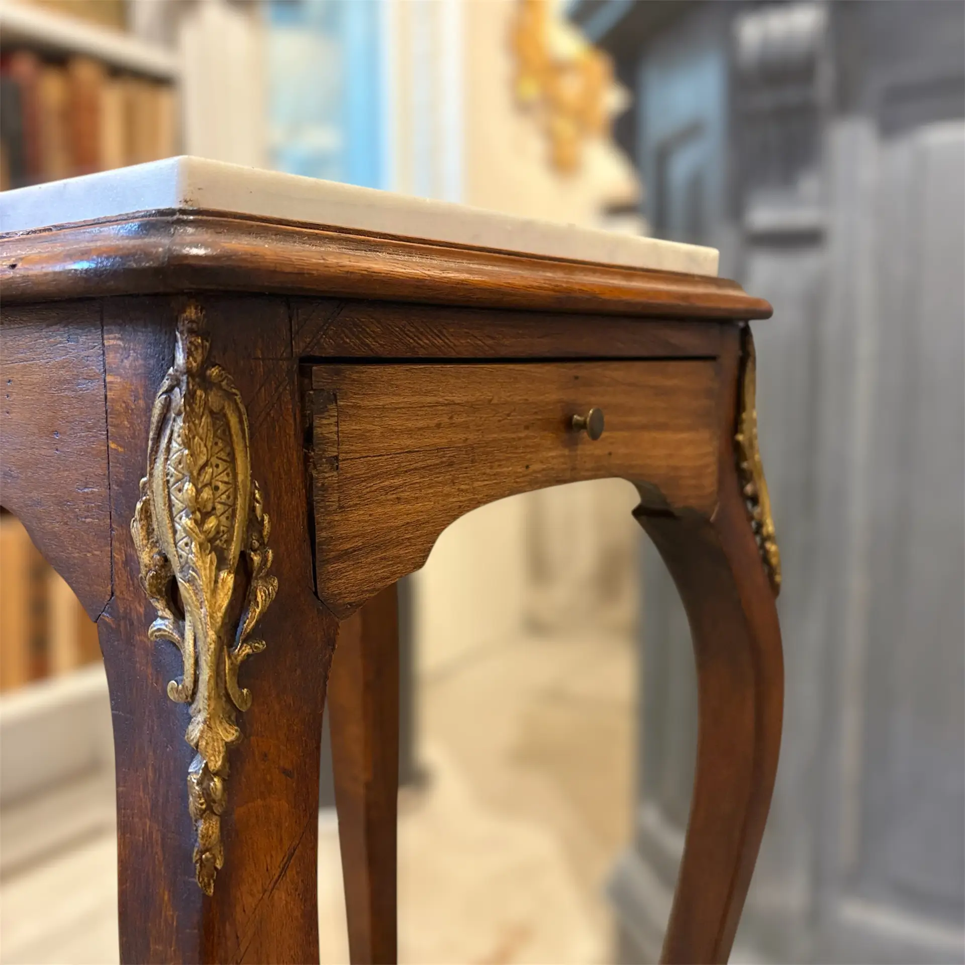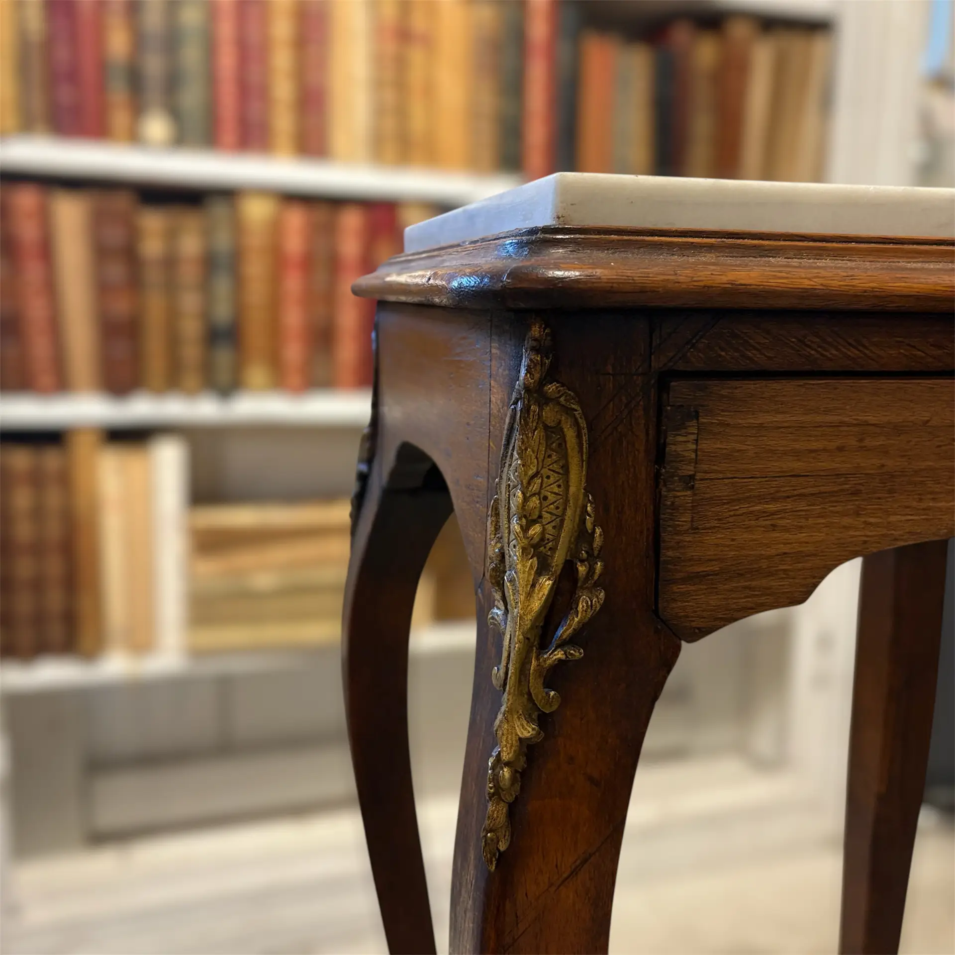 An elegant French Napoléon III period side table in the Louis XV style, featuring a white marble top set over a walnut frame with cabriole legs and finely cast gilt-bronze mounts. The single frieze drawer offers both form and function, while the sinuous lines and refined proportions embody the 19th-century revival of Rococo elegance favored during the Second Empire.